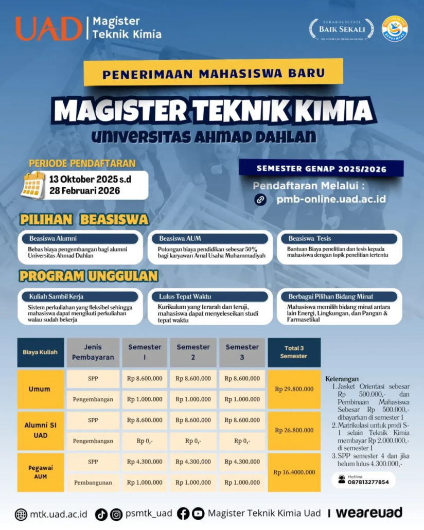 Magister Teknik Kimia UAD menawarkan berbagai jenis beasiswa untuk mendukung calon mahasiswa: