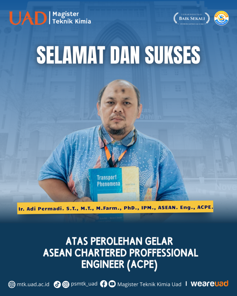 Program Magister Teknik Kimia Universitas Ahmad Dahlan (UAD) kembali mencatat prestasi akademik di tingkat internasional. Salah satu dosen terbaiknya berhasil memperoleh pengakuan sebagai ASEAN Chartered Professional Engineer (ACPE).