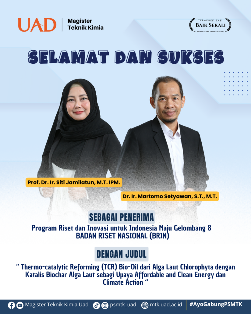 Prestasi membanggakan kembali diraih oleh dosen Magister Teknik Kimia Universitas Ahmad Dahlan (UAD). Prof. Dr. Ir. Siti Jamilatun, M.T., IPM. bersama Dr. Ir. Martomo Setyawan, S.T., M.T. berhasil menjadi penerima Program Riset dan Inovasi untuk Indonesia Maju Gelombang 8 yang diselenggarakan oleh Badan Riset dan Inovasi Nasional (BRIN). Keberhasilan ini menunjukkan kualitas dan komitmen dosen UAD dalam mengembangkan riset unggulan yang berkontribusi nyata bagi bangsa.