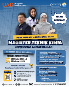 Program Studi Magister Teknik Kimia (PSMTK) Universitas Ahmad Dahlan (UAD) telah membuka Penerimaan Mahasiswa Baru (PMB) semester Genap Tahun Ajaran 2025/2026. PMB kali ini dibuka mulai tanggal 13 Oktober 2025 sampai 28 Februari 2026. Bagi calon mahasiswa yang berminat untuk mendaftar dapat melakukan pendaftaran secara online melalui pmb-online.uad.ac.id.