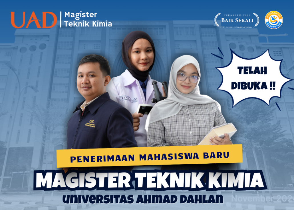 Program Studi Magister Teknik Kimia (PSMTK) Universitas Ahmad Dahlan (UAD) telah membuka Penerimaan Mahasiswa Baru (PMB) semester Genap Tahun Ajaran 2025/2026. PMB kali ini dibuka mulai tanggal 13 Oktober 2025 sampai 28 Februari 2026. Bagi calon mahasiswa yang berminat untuk mendaftar dapat melakukan pendaftaran secara online melalui pmb-online.uad.ac.id.