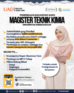 Program Studi Magister Teknik Kimia (PSMTK) Universitas Ahmad Dahlan (UAD) telah membuka Penerimaan Mahasiswa Baru (PMB) semester Genap Tahun Ajaran 2024/2025. PMB kali ini dibuka mulai tanggal 11 November 2024 sampai 27 Februari 2025. Bagi calon mahasiswa yang berminat untuk mendaftar dapat melakukan pendaftaran secara online melalui pmb-online.uad.ac.id.