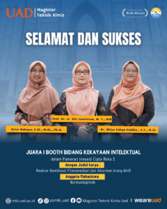 /in Berita Prodi /by VitaYogyakarta — Prestasi membanggakan kembali diraih oleh sivitas akademika Program Studi Magister Teknik Kimia Universitas Ahmad Dahlan (UAD). Tim dosen berhasil meraih Juara I Booth Bidang Kekayaan Intelektual dalam ajang Pameran Inovasi Cipta Reka 2 melalui karya inovatif berjudul “Reaktor Kombinasi Fitoremediasi dan Adsorben Arang Aktif.”